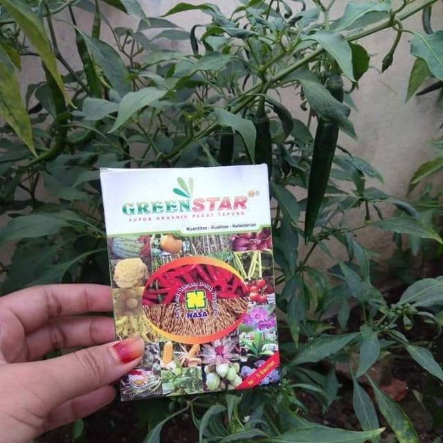 GREENSTAR NASASerbuk GREENSTAR sudah terdiri dari POC Nasa dan Hormonik sehingga lebih mudah dan praktis.Jika dikirim untuk teman atau untuk konsumen tidak terkendala diformulasi bentuk serbuk sehingga mudah dan praktis, terutama bila kita mengirim teman saudara dan konsumen yang terkendala larangan pengiriman dalam bentuk cair.Greenstar berguna untuk semua jenis tanaman pangan, buah dan palawija.Terobosan Baru Teknologi Pupuk OrganikDengan menggunakan Greenstar, pupuk Makro (NPK) bisa diKurangi 25%. Greenstar dapat diaplikasikan pada tanaman semusim, tahunan, tanaman hias & Juga Pembibitan. Greenstar Juga Meningkatkan Produktivitas Secara Kuantitas & Kualitas Dengan tetap Manjaga Kelestarian Lingkungan/Tanah (Aspek K-3).Greenstar dikemas unik, aplikasi lebih praktis & superekonomis. Isi per kotak 3 sachet.Dosis: 1). 1 sacset Greenstar untuk 14 s/d 17 liter tangki semprot.2). 3 sacset untuk 1000m2 per aplikasi,1 musim tanam interval 4 bulan 3 kali aplikasi.3). Dosis untuk pembibitan 1 sacset untuk 1000 s/d 2000 polybag4). Dosis untuk tanaman hias 1 s/d 2 gram per liter air,interval 1 s/d 2 minggu sekali disemprotkan kebawah daun atau disiramkan ke media tanam. Cara Pemakaian Greenstar :untuk penyemprotan dibagian daun.1).Ambil 1 sacset Pupuk GreenStar + 14-17 liter air aduk sampai merata.2).Masukan larutan Pupuk GreenStar tadi kedalam tangki semprot ukuran 14 s/d 17liter.3).semprotkan secara merata ke batang daun bunga maupun calon buah secara merata yang dijangkau.4).Interval penyemprotan 1-2 minggu sekali.Order/Konsultasi produkMenerima pendaftaran member NAS