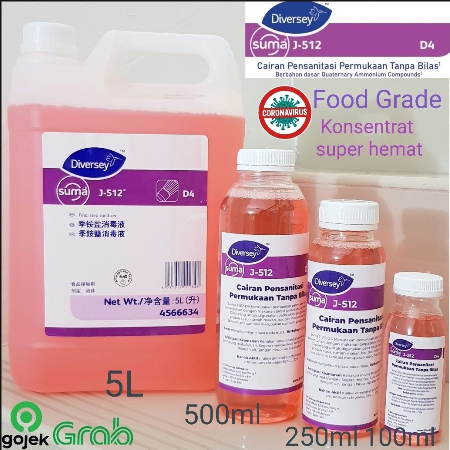 BABEE - DISINFECTANT DIVERSEY / CAIRAN SANITASI / ANTISEPTIK ANTI VIRUSIjin Kemenkes untuk Diversey: KEMENKES RI PKD 20311610509Suma J-512 D4 Adalah sanitasi yang aman untuk digunakan pada permukaan yang bersentuhan makanan. Suma J-512 D4 tidak memerlukan proses pembilasan bila digunakan sesuai anjuran.A. KEISTEMEWAAN :* Dapat mensanitasi semua permukaan yang bersentuhan dengan makanan dan permukaan yang dapat dibersihkan lainnya.* Metodi aplikasi yang mudah. * Dapat disemprotkan maupun sebagai larutan perendam.* Tidak perlu dibilas, cukup biarkan hingga kering.B. PENGGUNAAN :Untuk SANITASI ( membunuh Kuman dan Bakteri )Campurkan 10ml suma J-512 D4 dengan 5 liter airUntuk Desinfektan( membunuh Virus Corona) Campurkan 10ml suma J-512 D4 dengan 500ml airDisinfectant Diversey adalah Disinfectant wajib untuk di hotel hotel bintang 5Untuk membunuh JAMUR dan BAKTERI INI BIANG NYA YA JADI PAKENYA IRIT BANGET !!!100ml diversey bisa dapat 5liter Disinfectant siap pakai!Terima kasih sudah mampir di Babee
