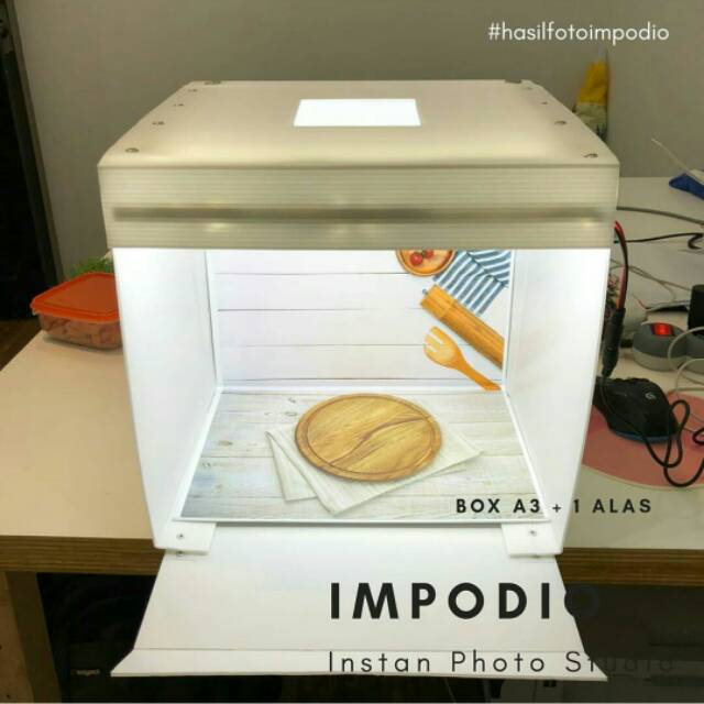Hallo kak, berikut pricelist studio foto Ukuran box Lebar x Tinggi x KedalamanBox A3 = 1KG31 x 30 x 24 : 180rb+ 1 alas : 220rb+ 2 alas : 250rbBox A2 = 2 KG44 x 30 x 24 : 250rb+ 1 alas : 320rb+ 2 alas : 370rbBox A1 = 3KG61 x 45 x 34 : 490rb+ 1 alas : 670rb+ 2 alas : 790rbMINI BOX - 27x22cm : 100rbBOX - 50x50cm : 360rbBIG BOX - 75x75cm : 735rbBIG BOX - 1x1m : 1.1jtBIG BOX - 1.2X1.2m : 1.3jtSemua Box Included : 1. Box photo (bahan coggurated plastik, anti air, bisa dilipat, bisa photo dari atas)2. Lampu LED 12V super terang3. Adaptor DC 12V4. 1 Background Putih5. 1 background HitamUntuk alasfoto :1. Papan board tebal2. Gambar High Res3. Pilihan gambar background TERBANYAK se- Indonesia4. Bisa dilepas pasang dari box